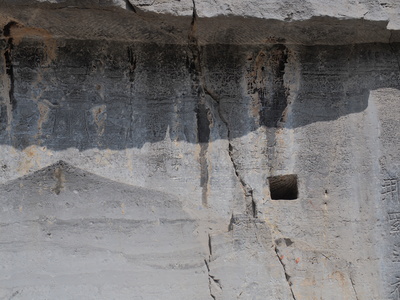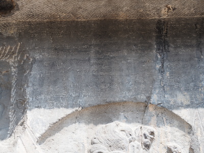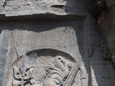 - 高1.78公尺,寬0.6公尺,刻有「迦毗羅神王」題記。頭部略偏向左邊,面有長鬚,衣著與持物皆與那羅延神王相似,不過身穿甲胄,露出鼓的肚子,右手握劍,但劍尖殘缺,左手持三叉戟。雙腳下踏著一隻似鹿的動物。